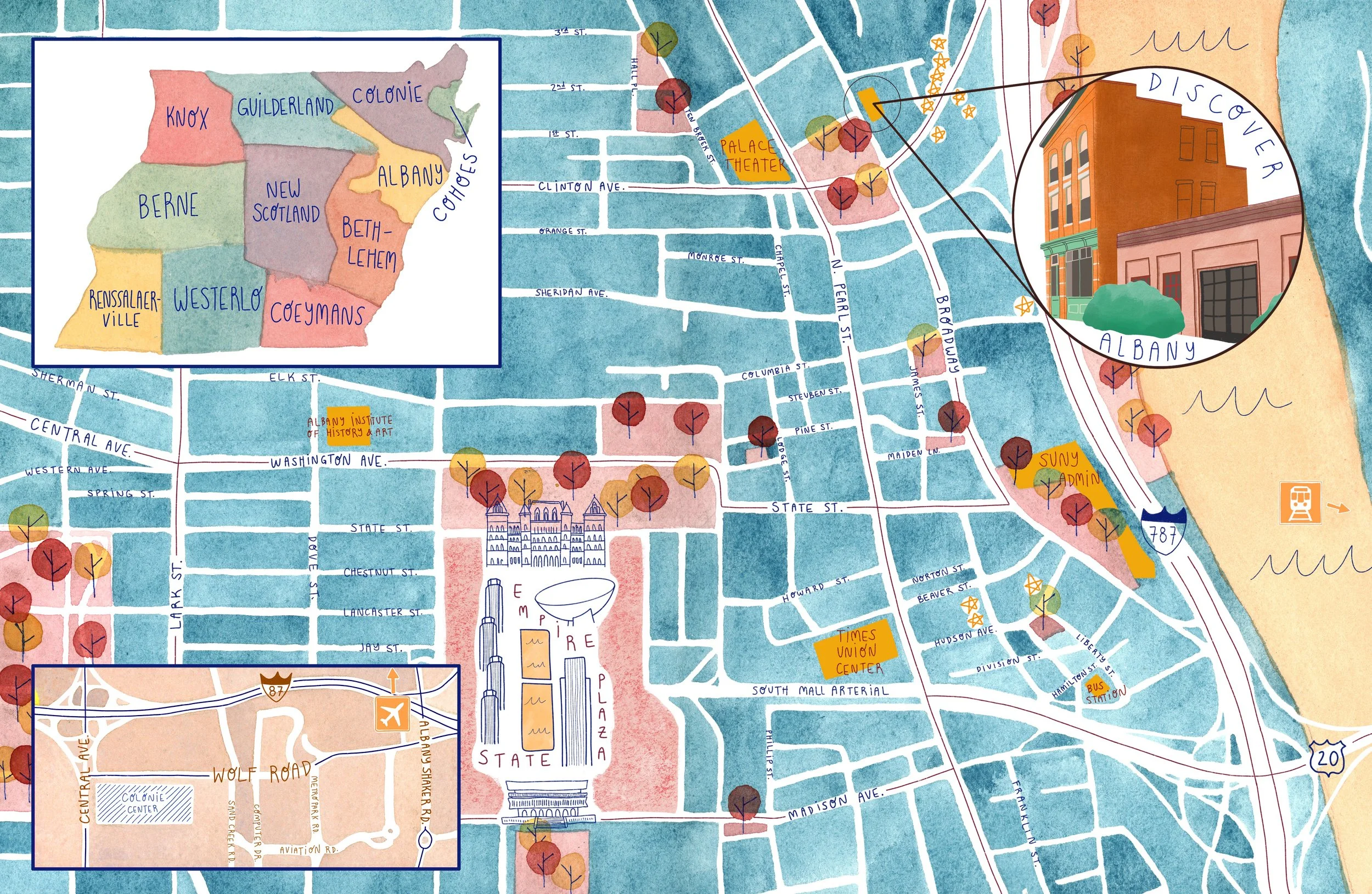 Watercolor illustrations for cover and full-spread map in the 2020 Discover Albany Visitors’ Guide.